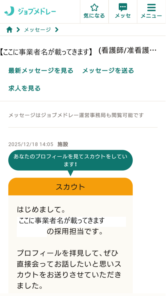 スカウト機能を利用するとジョブメドレーを通して事業所から連絡が来ます。ただ閲覧だけでもいいですし、スカウト機能で連絡が来たといって、わざわざ自分から連絡はしなくてもOKです!