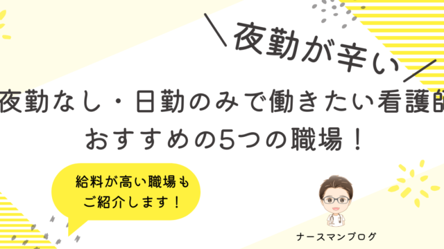 楽しく充実した働き方看護師の「夜勤がつらい!」を克服する!夜勤なし・日勤のみで働きたい看護師へおすすめしたい5つの職場! 夜勤が辛いと感じるのは当たり前です!今回は、夜勤が辛いを克服する!夜勤なしで日勤のみで働きたいおすすめ職場を5つご紹介します。外来のみのクリニック勤務・訪問看護・デイサービス・保育園での看護師業務・産業看護師です。高い給料の職場3つ!美容クリニック・透析クリニック・訪問看護も解説しています。 2024.07.05楽しく充実した働き方賢い働き方